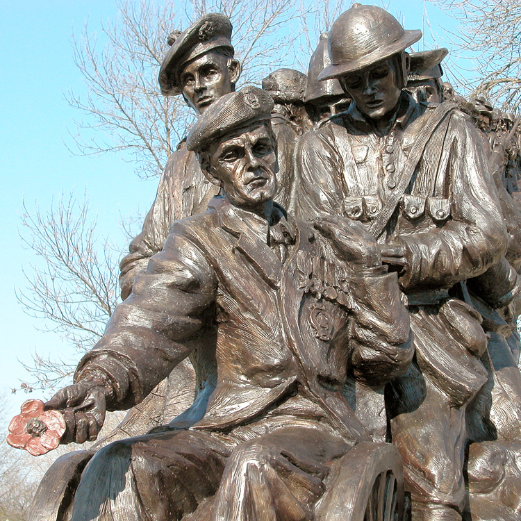 In 2006, Waterloo region local, Timothy Schmalz sought to erect a monument that would display an all-encompassing portrayal of Canadian veterans. Airmen, nurses, engineers, and soldiers across every Canadian war to date, form a growing line that culminates into a single figure, a veteran in a wheelchair with a poppy in his hand. The piece does not glorify war, nor does it present a limited view of those who are involved. It instead demonstrates that many, even the young, are dragged into the conflict, and regardless of the sought for glory and promise of adventure, a single fate of sorrow and loss awaits.